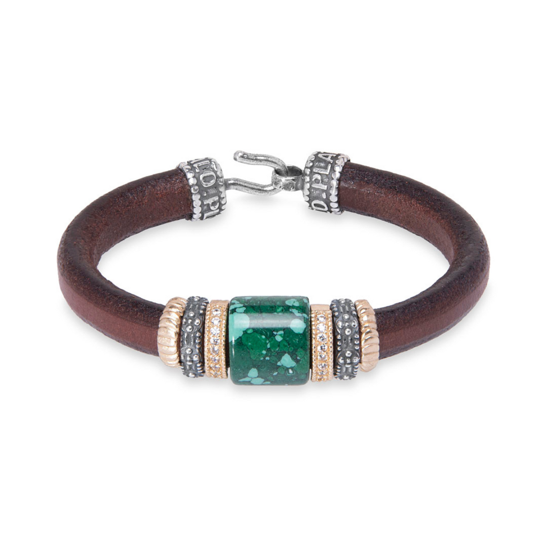 This bracelet fuses the warmth of brown leather with a touch of natural distinction. At its center, a stunning green stone takes center stage, flanked by spacers that combine the robustness of a dark metal with the elegance of bronze and the subtle shine of small inlays. With detailed clasps, it's a piece of jewelry that speaks of personality and a connection to authenticity, perfect for any occasion.