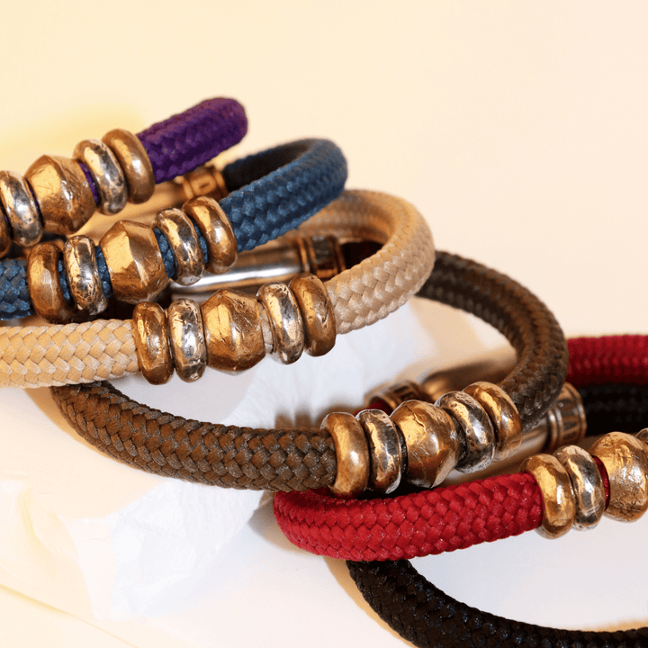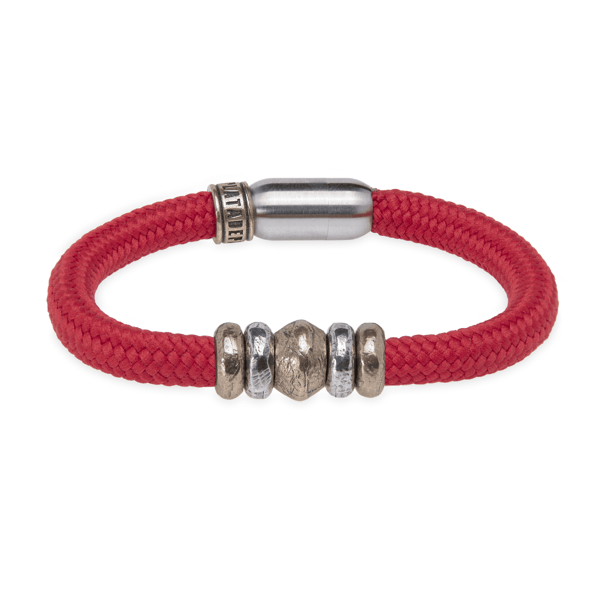 Ignite your style with this deep red nylon bracelet, a color that radiates passion and energy. The focal point is a sturdy bronze centerpiece, framed by two elegant, thin 925 silver pieces and two more bronze pieces. The combination of metals and the vibrant red hue make it the ideal piece for those looking to stand out and boldly express their personality.