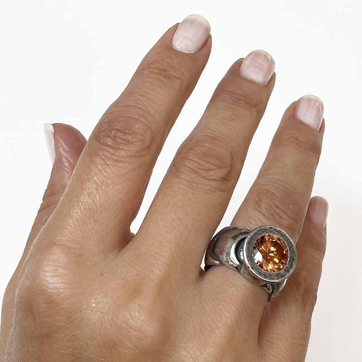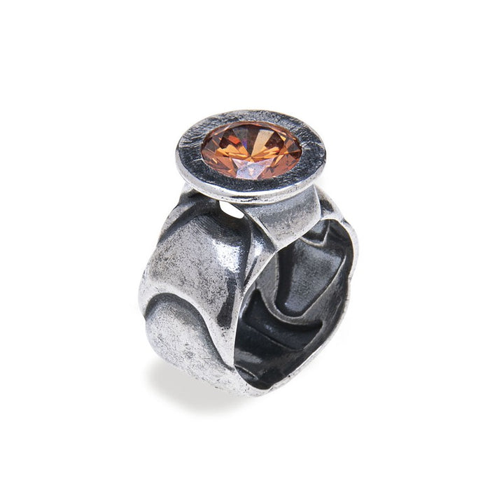 Ring in 925 Silver, braided in the shape of a reptile with a 10 mm round citrine-coloured hydrothermal quartz and a width of 12 mm. Identified on one side with the brand symbol.