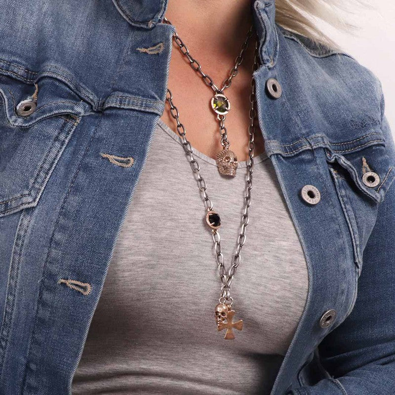 925 silver-plated link chain necklace. Featuring a bronze skull and cross, and a bronze piece with onyx. Designed and handcrafted by PLATADEPALO in Spain.