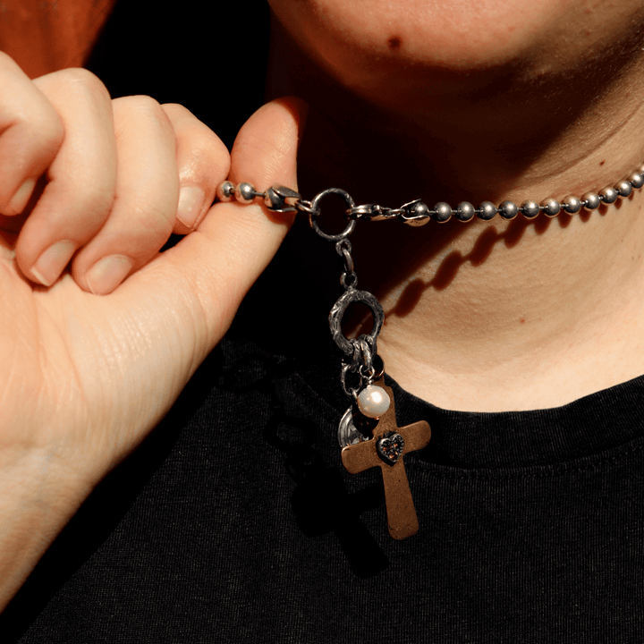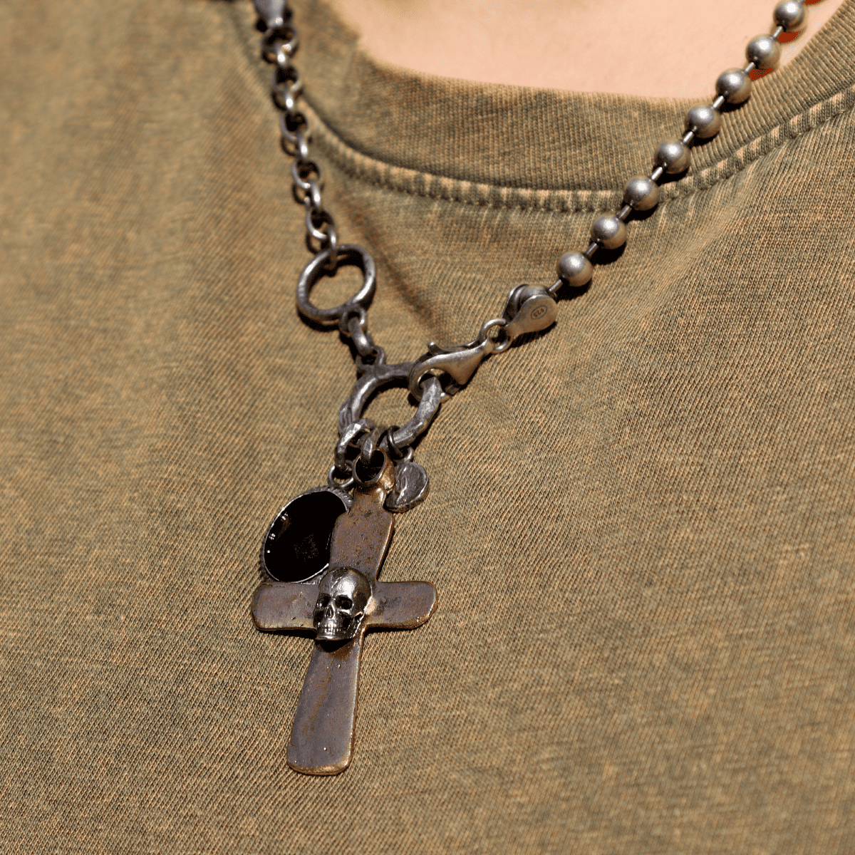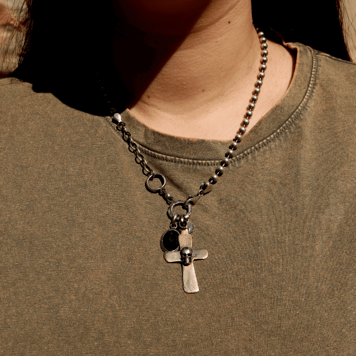 Largo 42CM. Esta cadena en rosario, elaborada meticulosamente en Plata 925, combina fuerza y estilo en un diseño único y atrevido. Su pieza central en forma de cruz, realizada en bronce con una calavera de plata con el logo de PLATADEPALO e incrustaciones de circonitas aportan un aire misterioso y poderoso.
