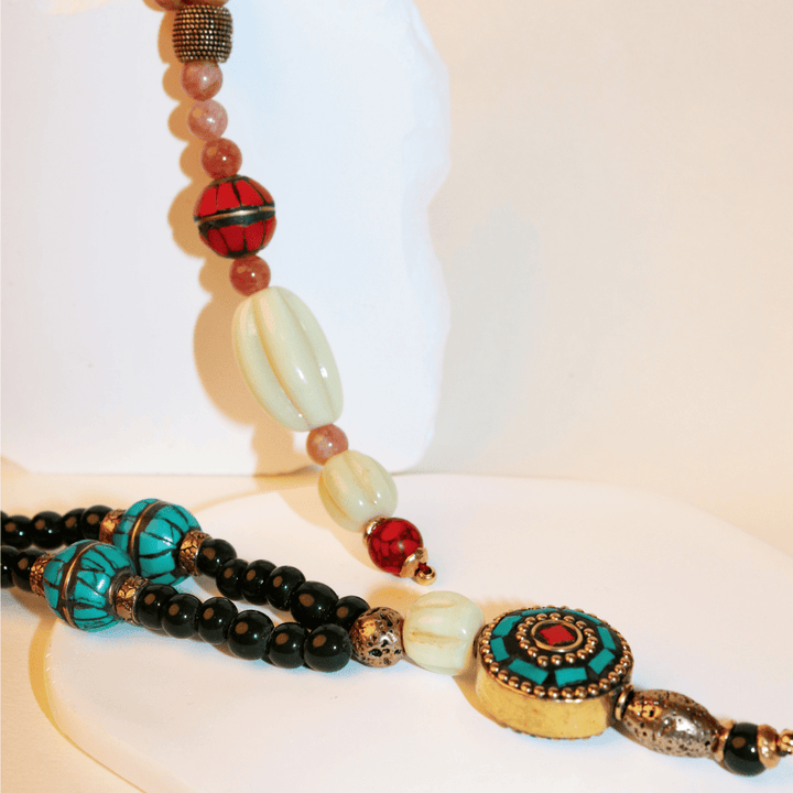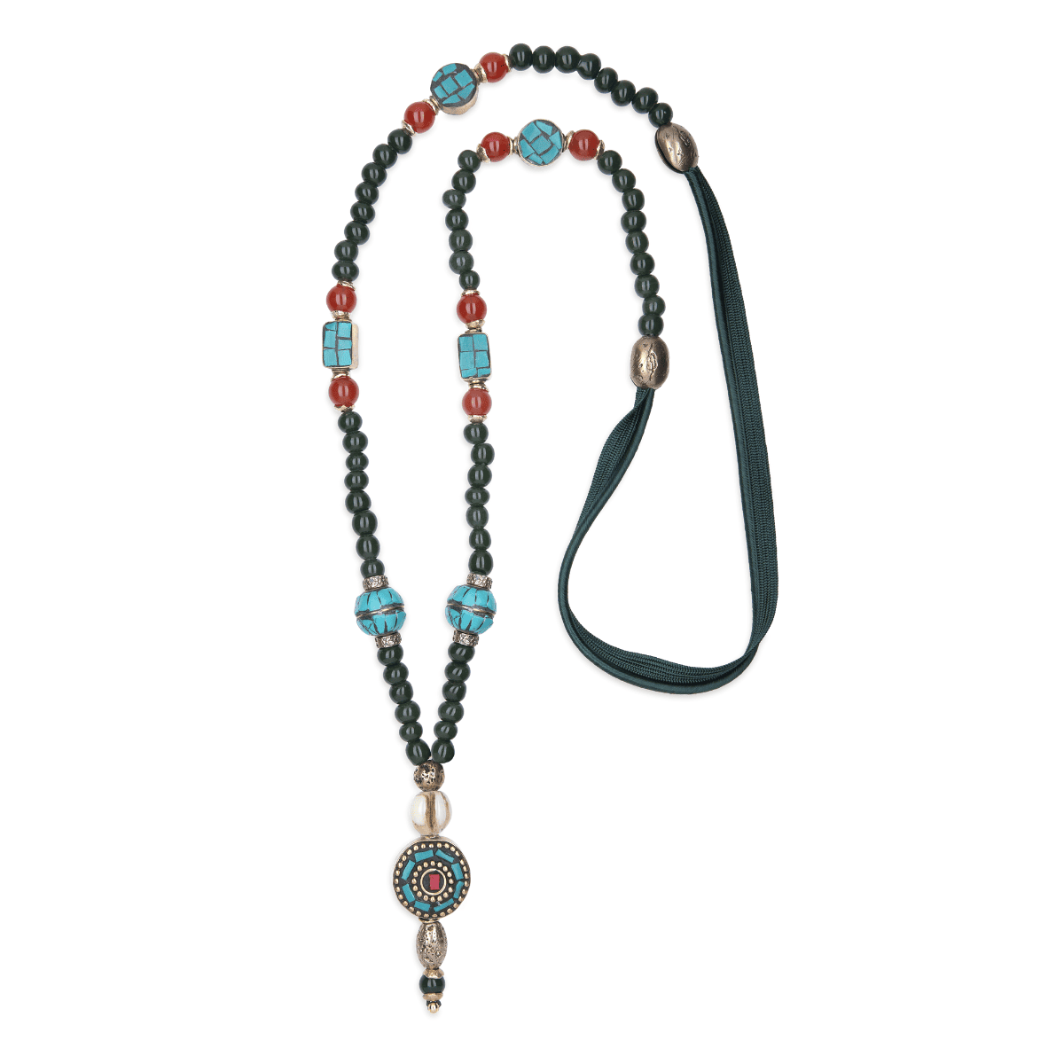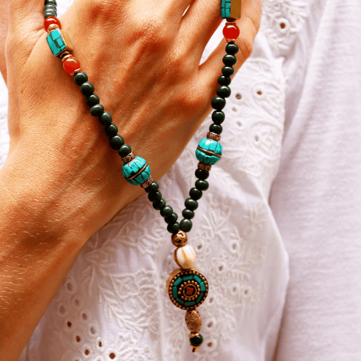 Descubre en este collar largo que evoca la serenidad de la naturaleza. Sus piedras verdes profundas se entrelazan con la frescura de las entrepiezas turquesas, creando un vibrante contraste. Los detalles en bronce añaden un toque rústico y atemporal, haciendo de esta una pieza única que infunde calma y un estilo con alma.