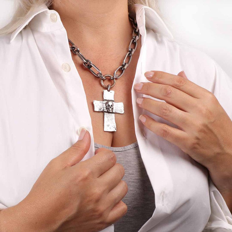 Collar en cadena de eslabones bañados en Plata 925. Incorpora una cruz con calavera bañada en Plata 925..