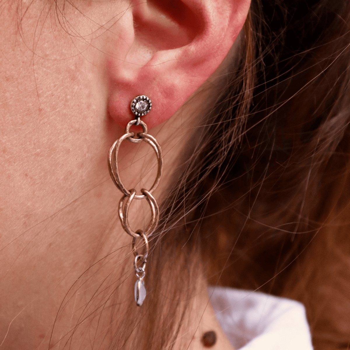 La combinación del bronce y la calcedonia verde crea un contraste armonioso que no pasará desapercibido. Este pendiente es perfecta para quienes buscan una pieza que refleje su personalidad única y bohemia.