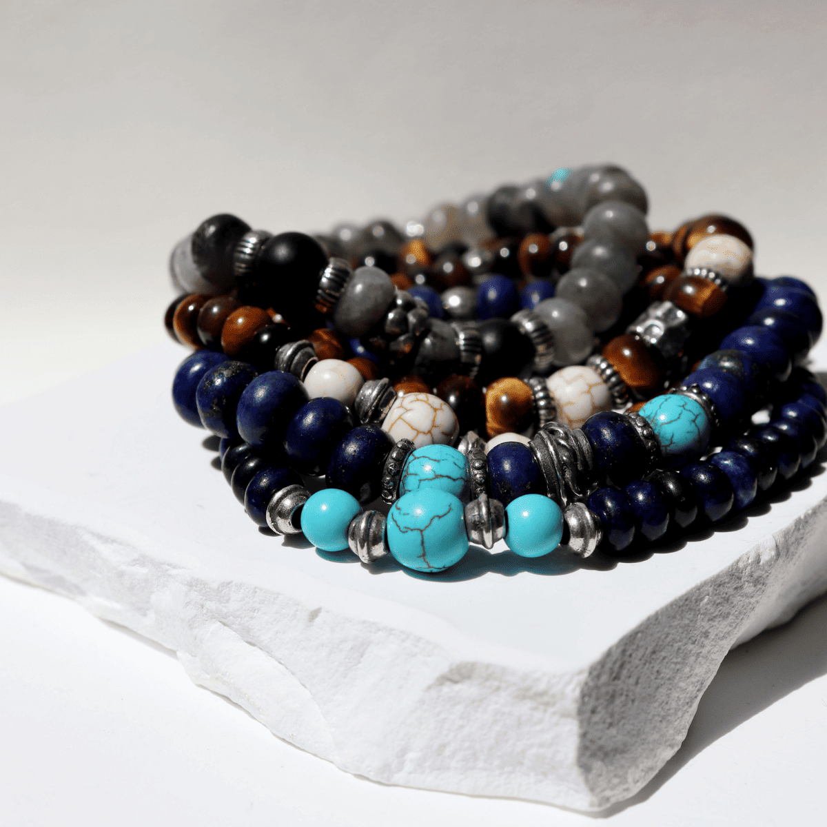 Pulsera de hombre Soryu de bolas medianas elástica de piedras lapislázuli en forma de donut 6 mms, entrepiezas y tapanudos de plata 925 y piedras turquesa reconstituida.