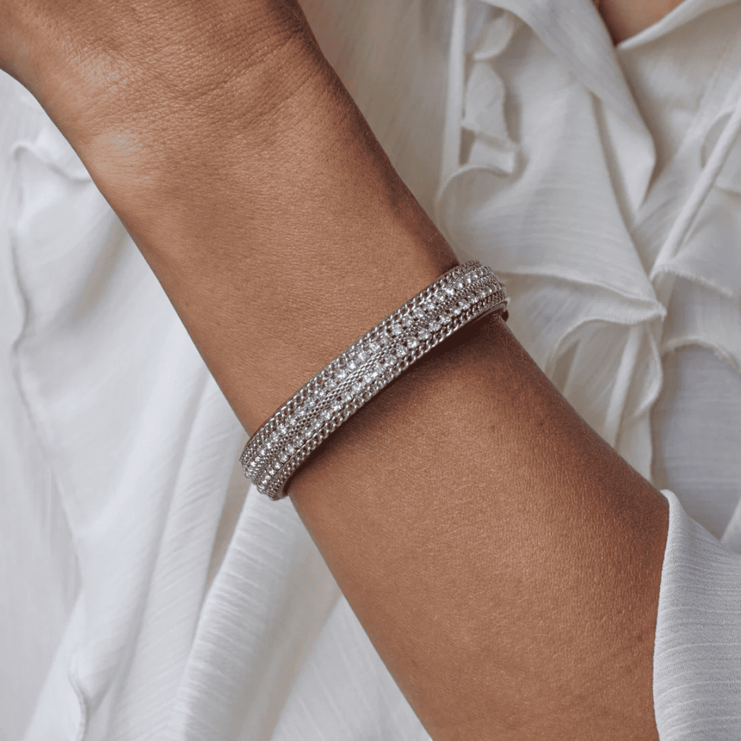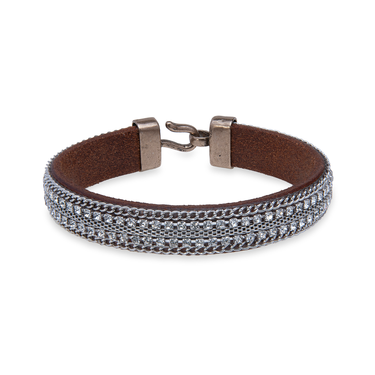 La pulsera Lira está confeccionada en cuero plano de 1 cm, esta pieza destaca por su elegante pasamanería en tonos plateados y brillos, que aporta contraste y profundidad al diseño.