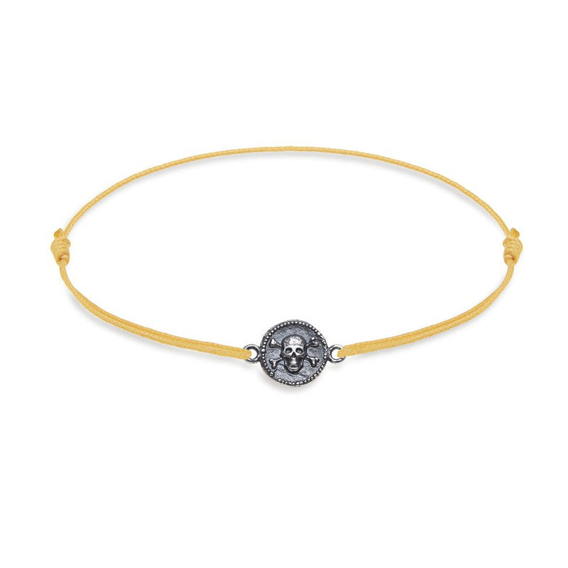 Nuestro básico imprescindible en tu joyero no puede faltar. Pulsera de nylon ajustable en color amarillo con una calavera y huesos labrados en una pieza circular de Plata 925. Diseñada y hecha a mano artesanalmente por PLATADEPALO en España.